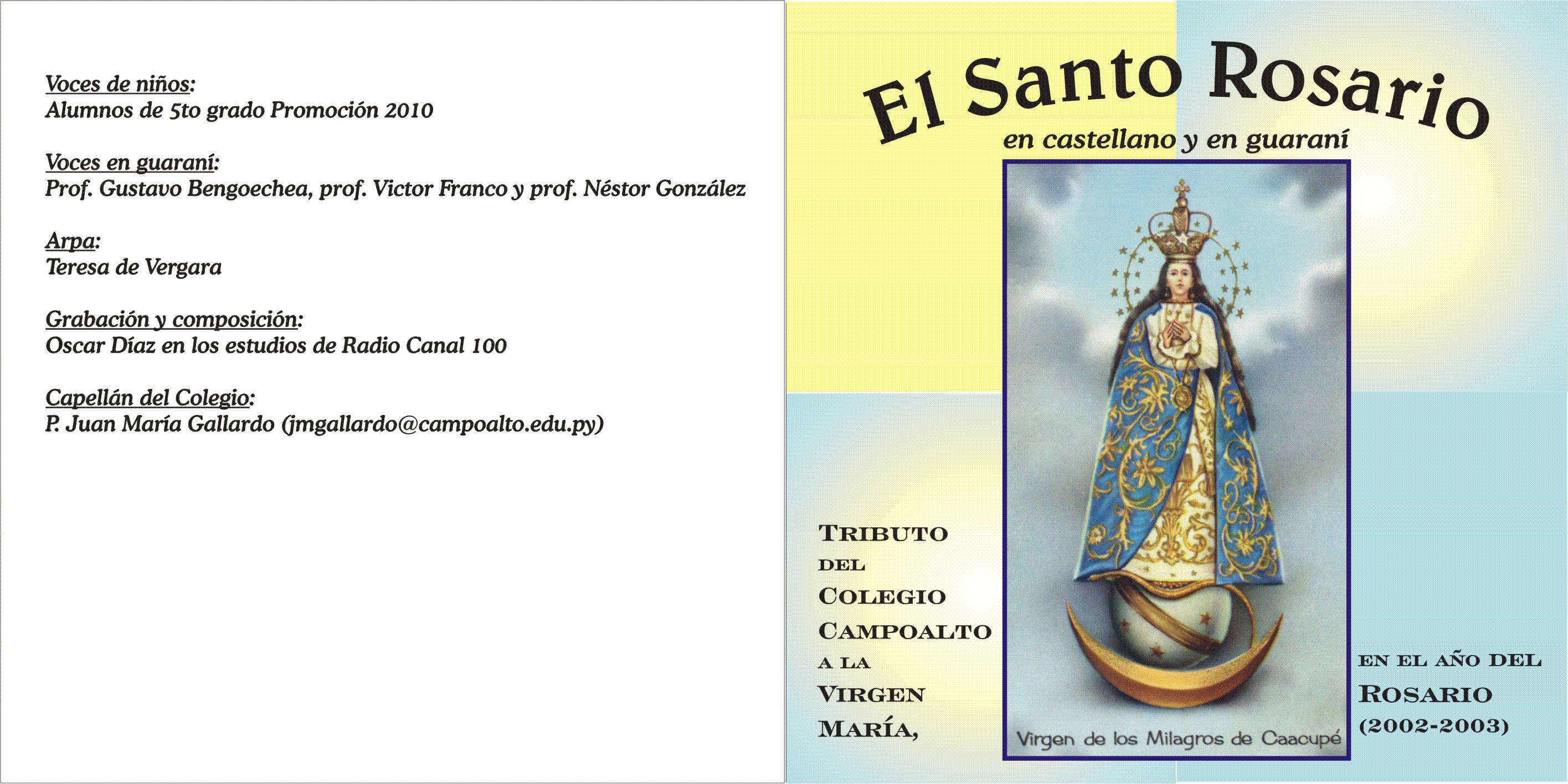 |  III. El Rosario rezado por S.S. Juan Pablo II En latín. Duración: 21´ Peso del archivo: 3,11 MB IV. El Rosario en guaraní (Colegio Campoalto) Alto: en 128 kbps 1. Introducción 2. Primeros Misterios 2. Segundos Misterios 3. Terceros Misterios 4. Cuartos Misterio 5. Quintos Misterios 6. Agradecimientos Medio: en 64 kbps 1. Introducción 2. Primeros Misterios 2. Segundos Misterios 3. Terceros Misterios 4. Cuartos Misterio 5. Quintos Misterios 6. Agradecimientos Muy bajo: en 24 kbps 1. Introducción 2. Primeros Misterios 2. Segundos Misterios 3. Terceros Misterios 4. Cuartos Misterio 5. Quintos Misterios 6. Agradecimientos |